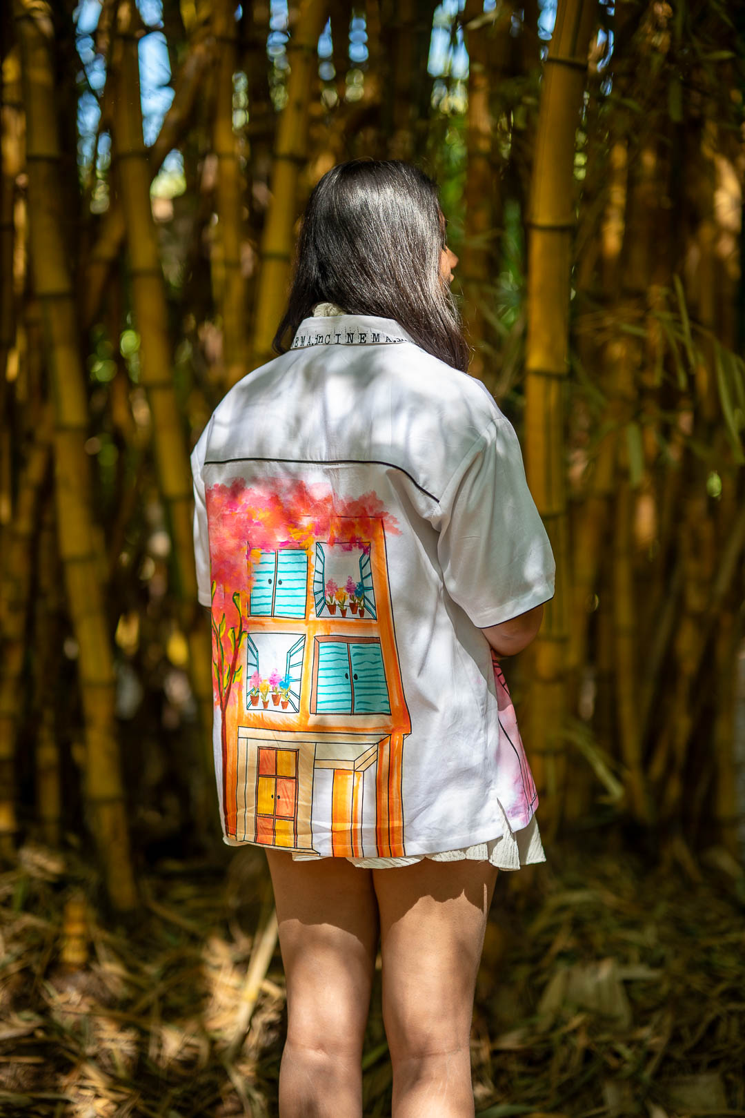 Hues of pink printed shirt with main artwork on back and front right corner consisting of double yoke and black piping.